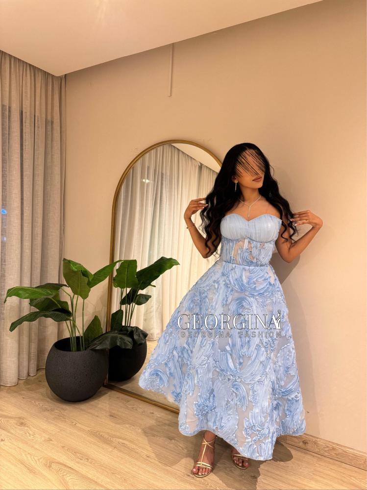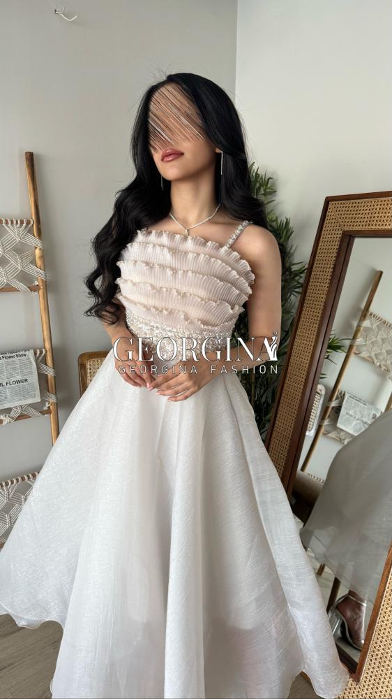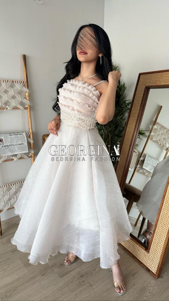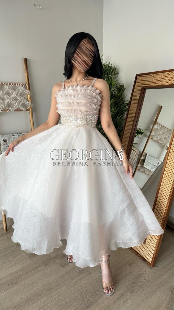 فستان بيج فاتح من متجر جورجينا، فستان سهرة كلوش منفوش بلون بيج فاتح ساحر مصنوع من قماش الأورجانزا الراقي المزدان بتفاصيل جازان باربي، يمنحك إطلالة مفعمة بالرقة والأناقة في جميع المناسبات.