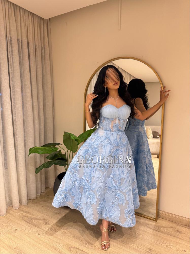 - تصميم أنيق: يجمع بين قصة الكلوش الكلاسيكية وأناقة فساتين السهرة.
