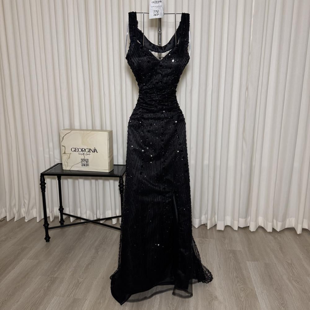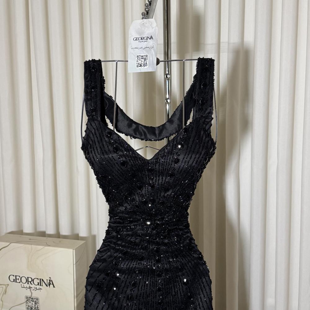 فستان سهرة اسود مفتوح من جورجينا فاشن: فستان "دندونا" يجمع بين اللون الاسود الغني وتصميم الكريستال الشك المتقن، بالإضافة إلى القصة المفتوحة الجريئة، ليمنحكِ إطلالة عصرية ومبهرة.
