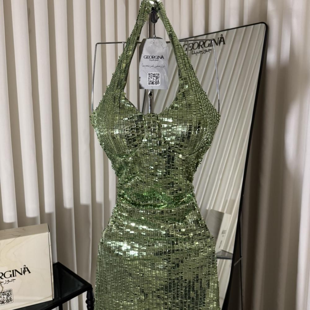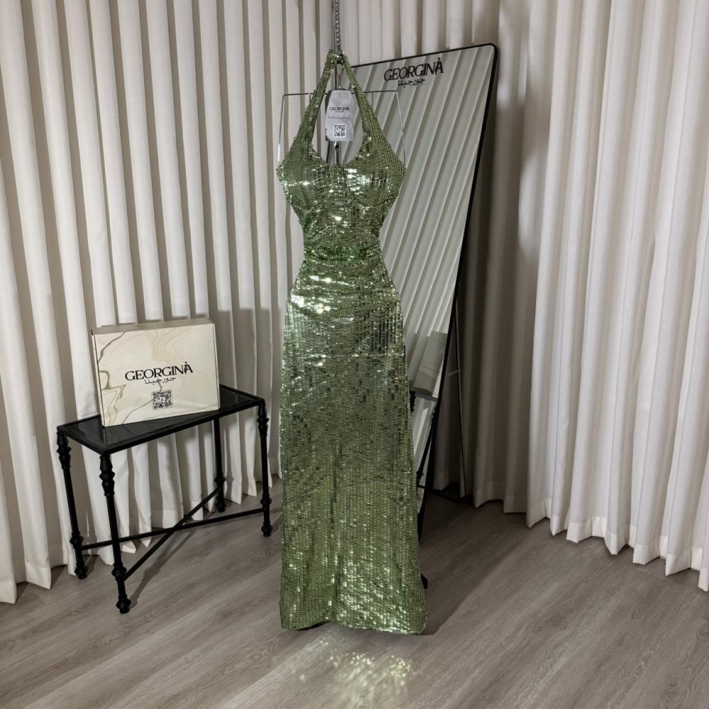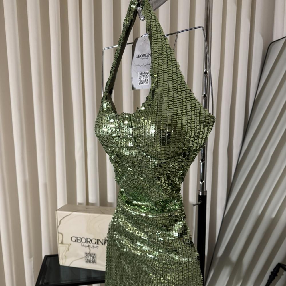 فستان سهرة تفاحي طويل من جورجينا فاشن: فستان "رفايين" يضفي عليكِ لمسة حيوية وفخامة لا مثيل لها، بتصميمه الساحر من الترتر اللامع بلون التفاحي الجذاب.