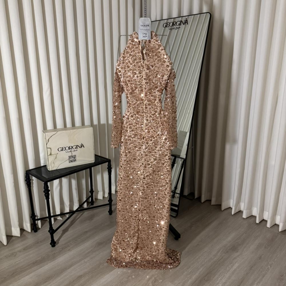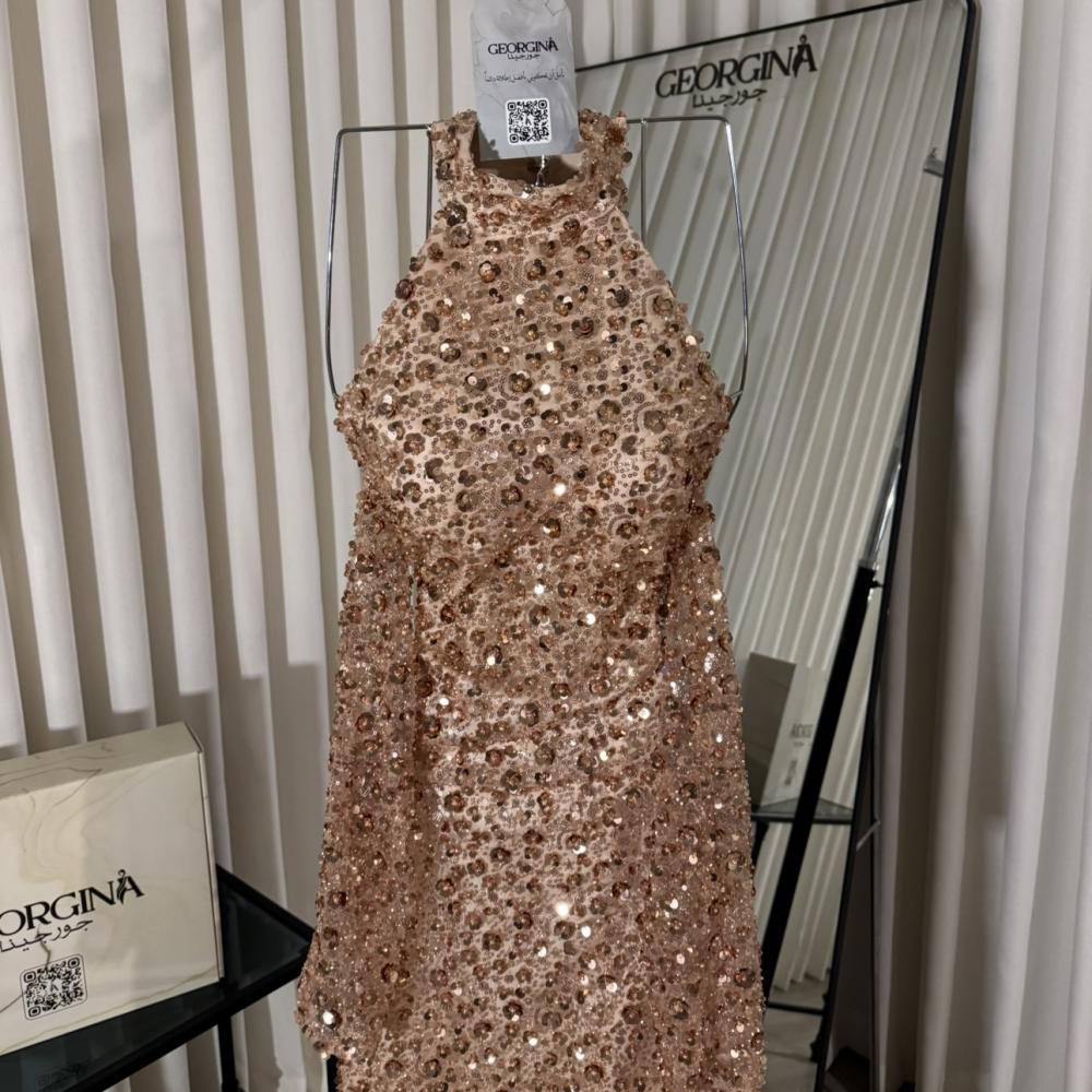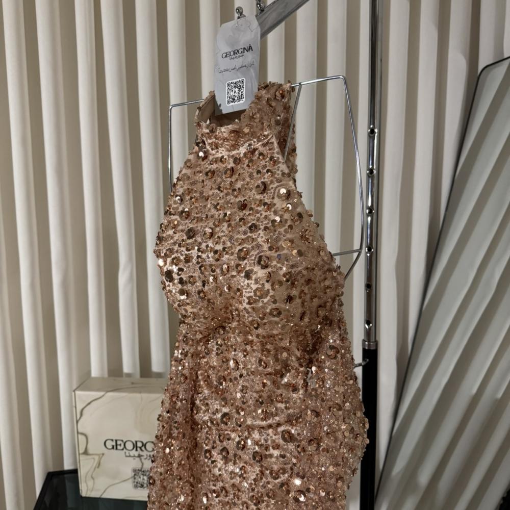 فستان سهرة ذهبي طويل من جورجينا فاشن: فستان "اميار" يجسد الفخامة المطلقة بلونه الذهبي البراق، والمزين بكثافة من الترتر والخرز اللامع، ليمنحكِ إطلالة ملكية متوهجة تخطف الأنظار.
