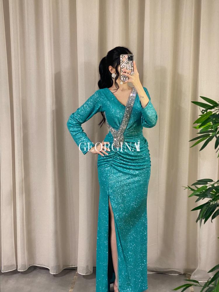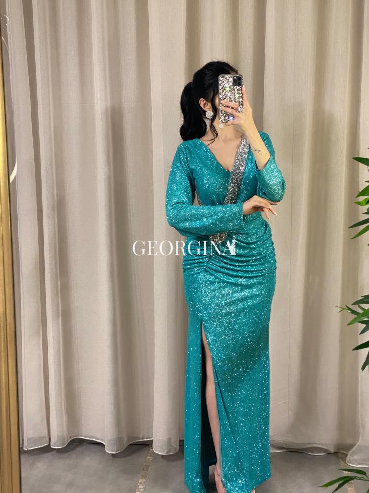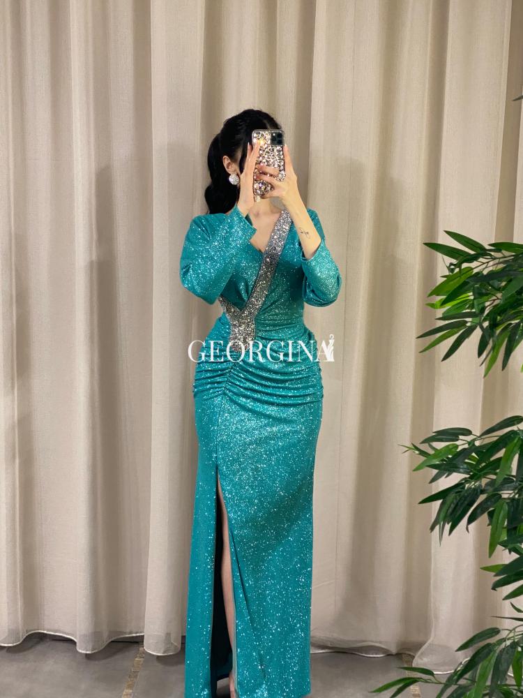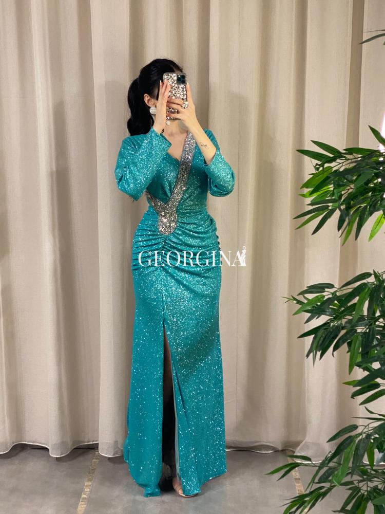 فستان سهرة مطرز مفتوح قطعة أساسية في خزانة كل امرأة تبحث عن إطلالة ساحرة ومميزة في المناسبات الخاصة. يجمع هذا الفستان بين الأناقة العصرية واللمسة الكلاسيكية من GEORGINA، حيث يضفي اللون التركواز البراق والترتر اللامع سحراً خاصاً على إطلالتك.